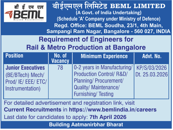 BEML Limited, a Government of India undertaking under the Ministry of Defence, has announced an upcoming recruitment notification for ITI Trainees and Diploma Trainees across various trades and engineering disciplines. Candidates with ITI qualifications or Diploma in Mechanical/Electrical Engineering will be eligible to apply once the detailed notification is released. This recruitment offers a strong opportunity for technical candidates to start their careers in a reputed PSU. The detailed advertisement with vacancy numbers and application dates is expected soon, and the application process will be conducted online.
